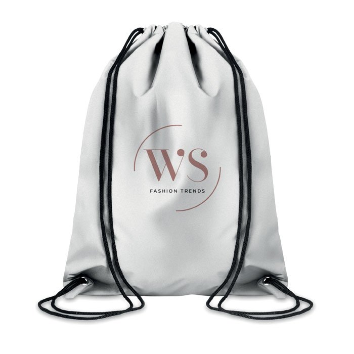 Drawstring bag in high reflective 190T polyester.