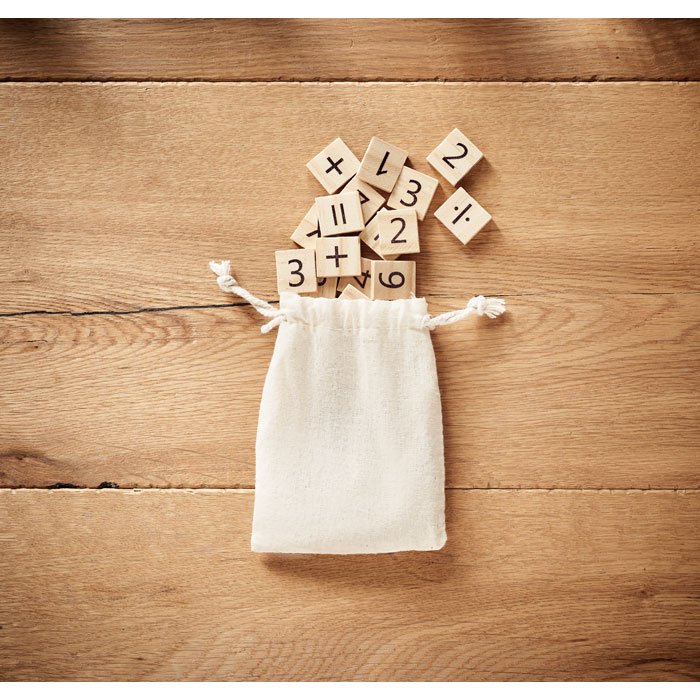 Wooden educational counting game in cotton pouch. A great way for kids to learn how to count in a playful manner. Includes 32 pieces.