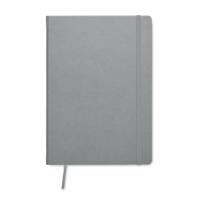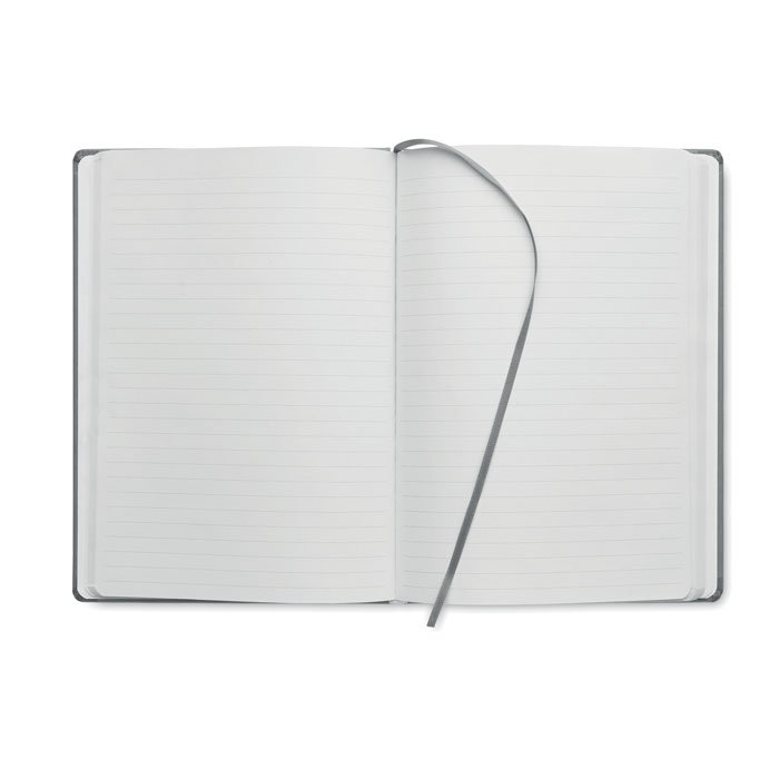 A5 notebook with hard PU cover. Casebound. 200 lined pages (100 sheets) in recycled paper (80 gsm). Matching elastic closure strap and ribbon page-marker. Made in EU.