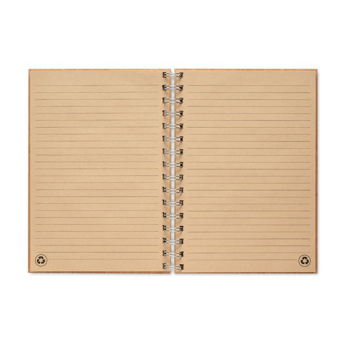 Bamboo cover notebook. Twin-wire ring bound, 140 lined kraft paper pages (70 sheets). Bamboo is a natural product, there may be slight variations in colour and size per item, which can affect the final decoration outcome.