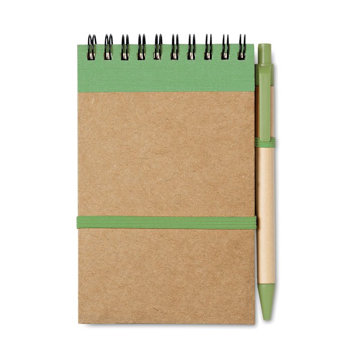 Recycled paper notebook with matching pen. Twin-wire. 140 plain recycled paper pages (70 sheets). Matching push button ball pen in recycled carton and biodegradable plastic. Blue ink. Elastic closure strap and pen holder.