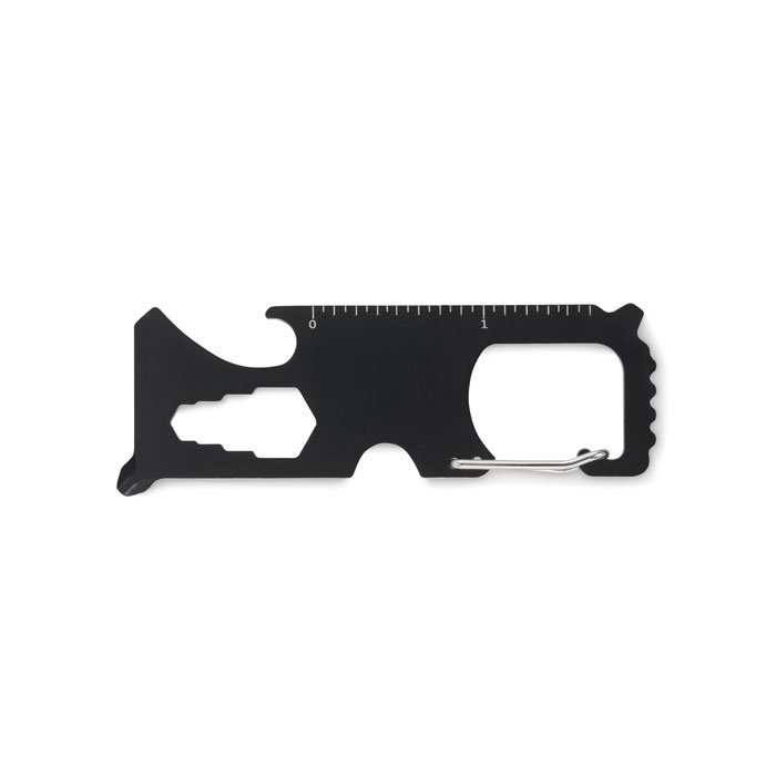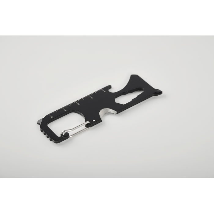 Stainless steel multi-tool pocket card tool. 8 functions. It includes: tooth saw, wire cutter, spanner, Phillips screwdriver, slotted screwdriver, measuring scale, bottle opener and key chain.