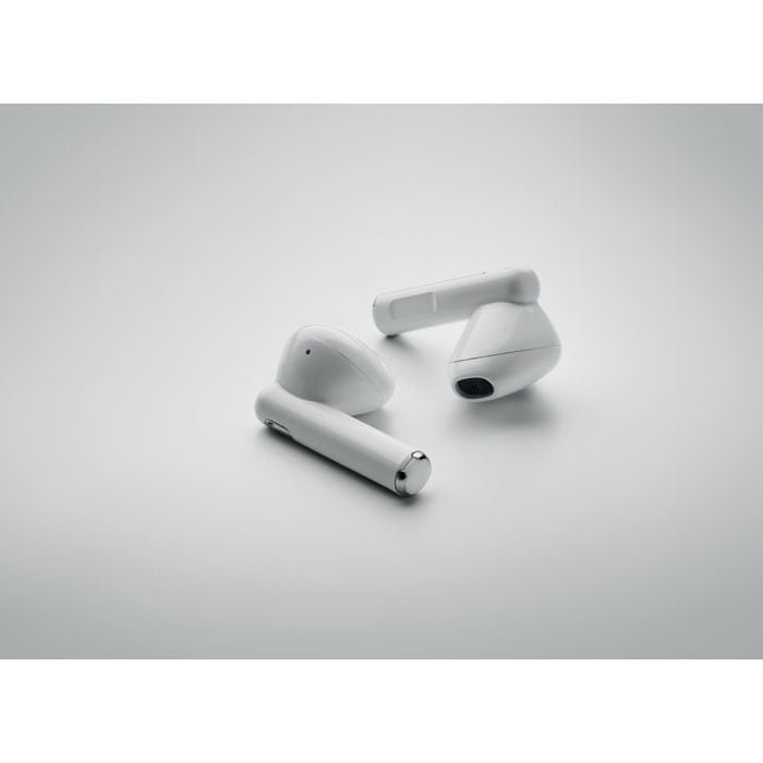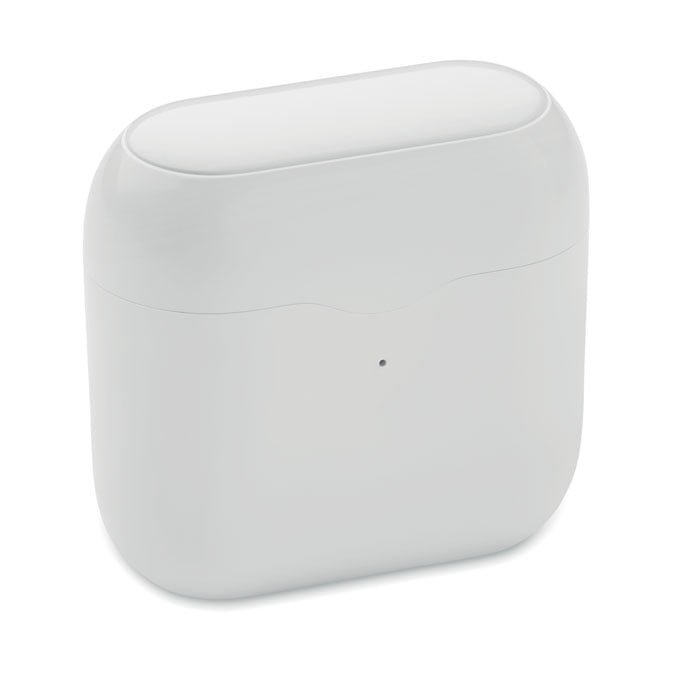ABS True Wireless Stereo (TWS) 5.3 wireless stereo earphones with microphone and 30 mAh build-ion battery and 200 mAh charging box. Playing time approx. 4 hours. Auto-pairing.