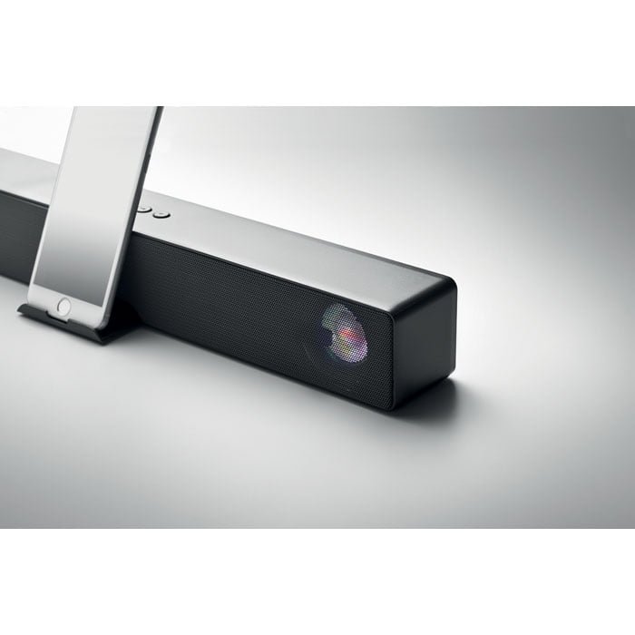5.0 Wireless soundbar speaker in ABS with changing mood light and phone stand functionality. Connect your mobile device wirelessly with the soundbar to play your favourite music or podcasts. The built-in mood light will bring a nice atmosphere to your living room or office. The light can change automatically or can be adjusted via your smartphone. The speaker has a rechargeable 2000 mAh Li-ION battery, so you can place it anywhere in your home without having to worry about cables. When fully charged, the total playing time is approximately 4 hours. Output data: 5W.