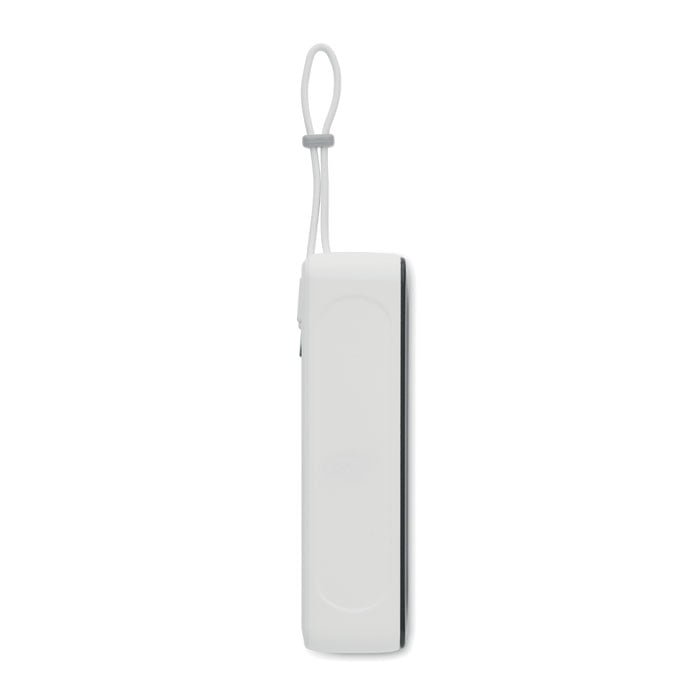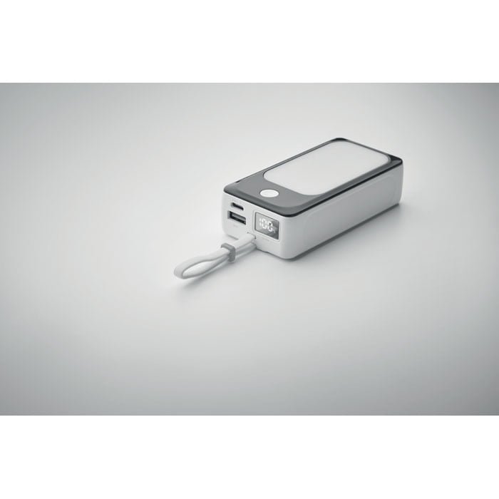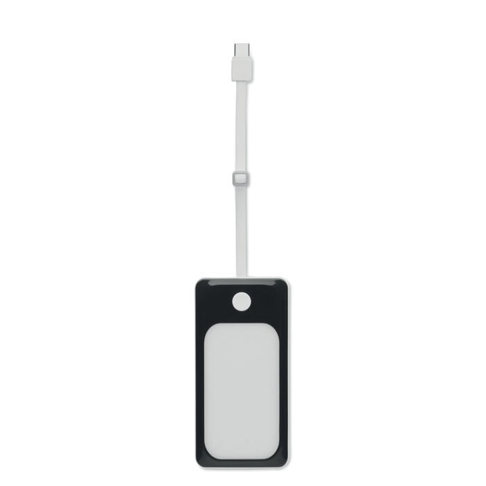 Power bank 10000 mAh capacity in abs casing. Output current DC5V/2A 1x type A and 1x type C in/out. Includes indicating 4 light setting (9 COB led) and integrated USB cable with Type C plug output. PD 22,5W support with battery display.