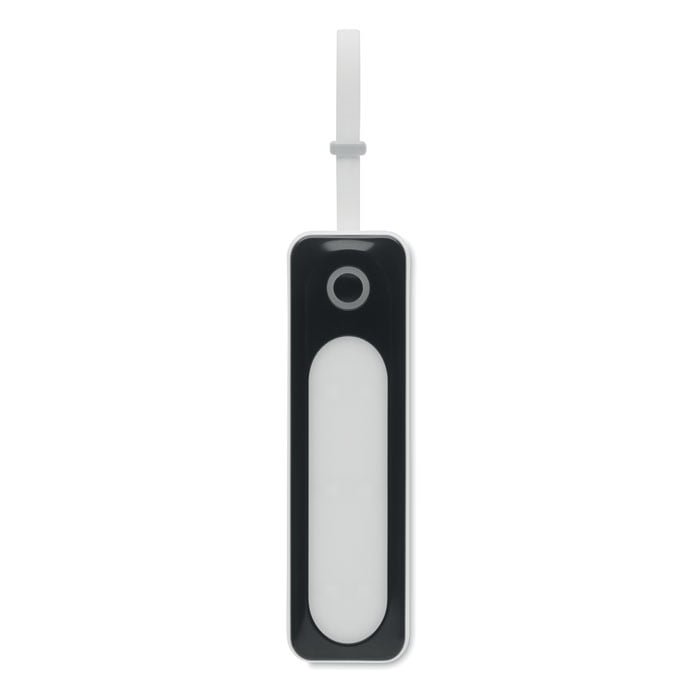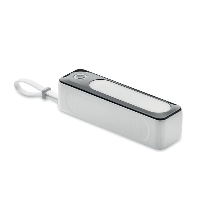 Power bank 5000 mAh capacity in abs casing. Output current DC5V/2A 1x type A and 1x type C in/out. Includes indicating 4 light setting (6 COB led) and integrated USB cable with Type C plug output.